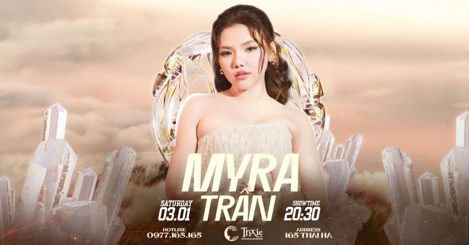 Hãy để đêm 03.01 trở thành khoảnh khắc đầu năm đầy cảm xúc, nơi âm nhạc của Myra Trần chạm đến trái tim bạn. Đặt chỗ ngay hôm nay để không bỏ lỡ cơ hội thưởng thức giọng ca đầy nội lực, truyền cảm hứng và bùng nổ này tại Trixie Cafe & Lounge – 165 Thái Hà.